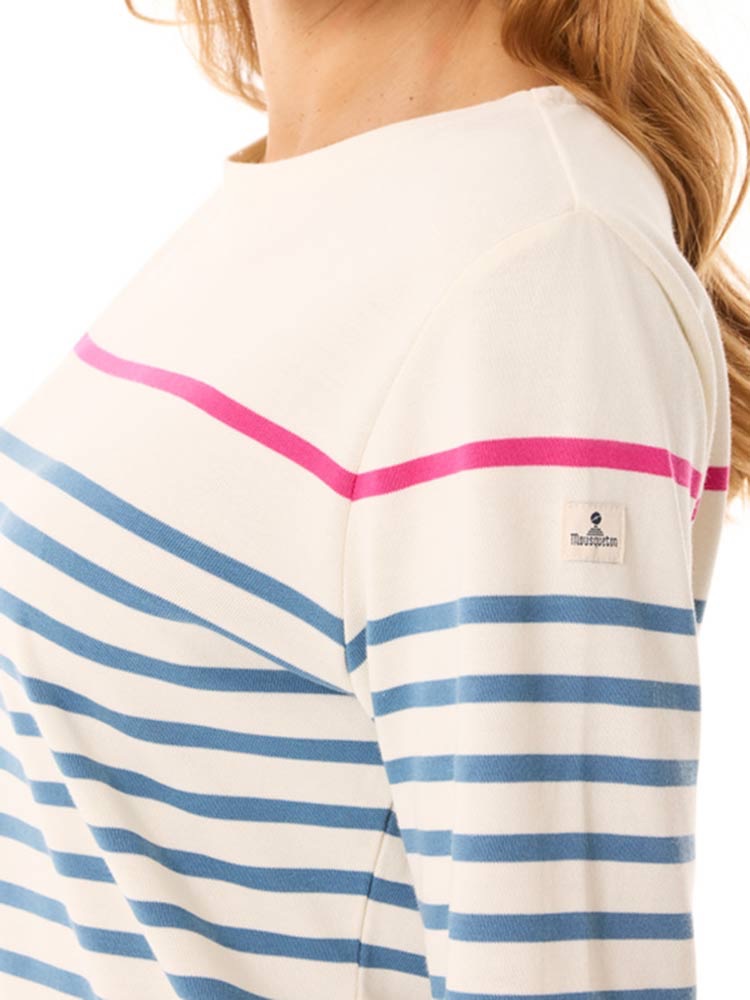 A fresh take on a maritime classic. This French-designed 3/4 sleeve shirt features the traditional boat neckline and side-slit detail, crafted from a premium, heavy-weight soft cotton. This season introduces a striking colourway: a cream base accented by a singular fuchsia pink stripe at the chest, followed by stormy blue lines. Finished with the sleeve branding tag.