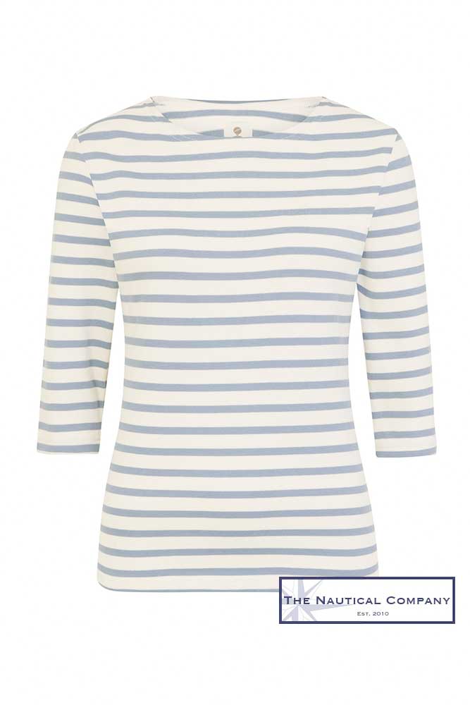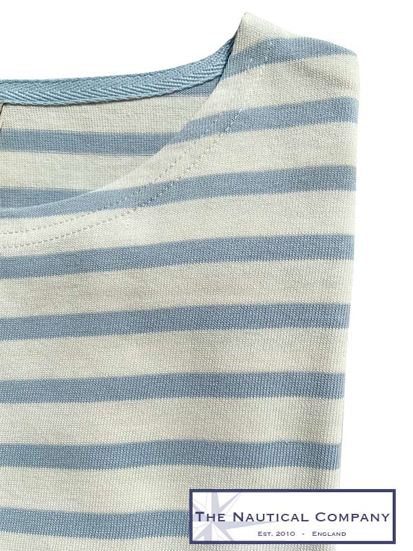 New colour this season for our stripe fans, a cream/pale blue designed in France, 3/4 sleeves, boat neckline, side slits and label product tag on one upper arm sleeve.