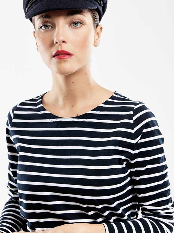 A classic light jersey cotton striped tee shirt for women by French label Armor Lux. Long sleeved round neck shirt in mainly dark navy with white stripes.