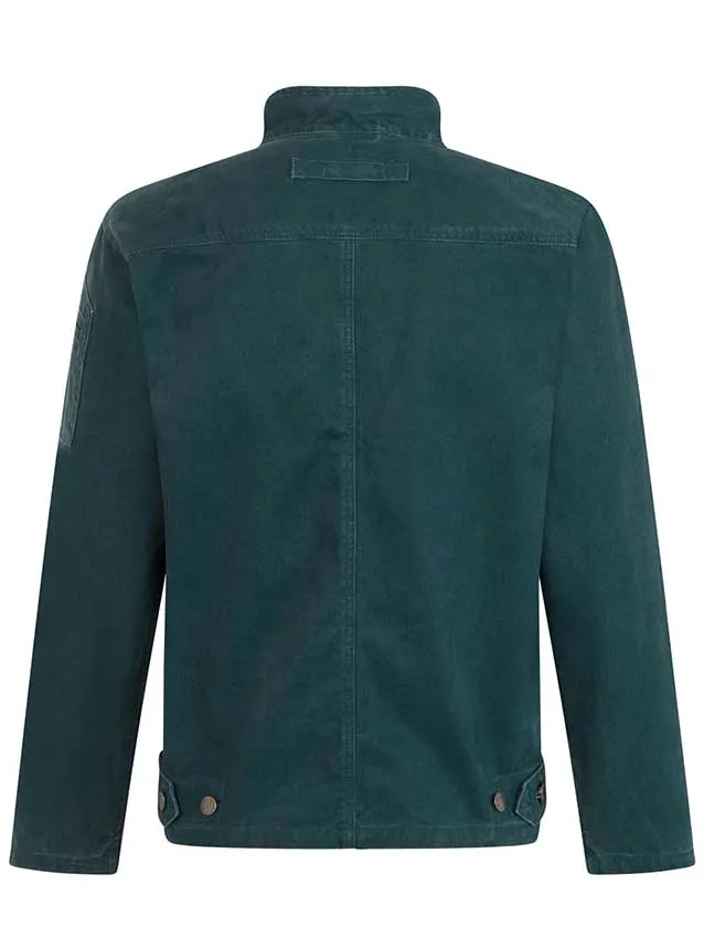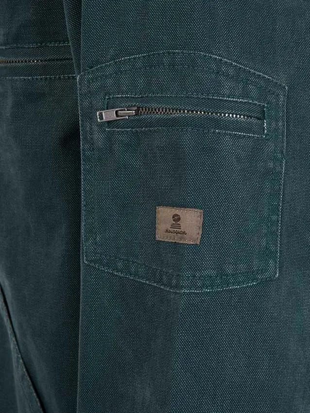 A quality mid-season canvas worker zip-up jacket for men from French label Mousqueton in distressed petrol blue, windproof and water repellent featuring: