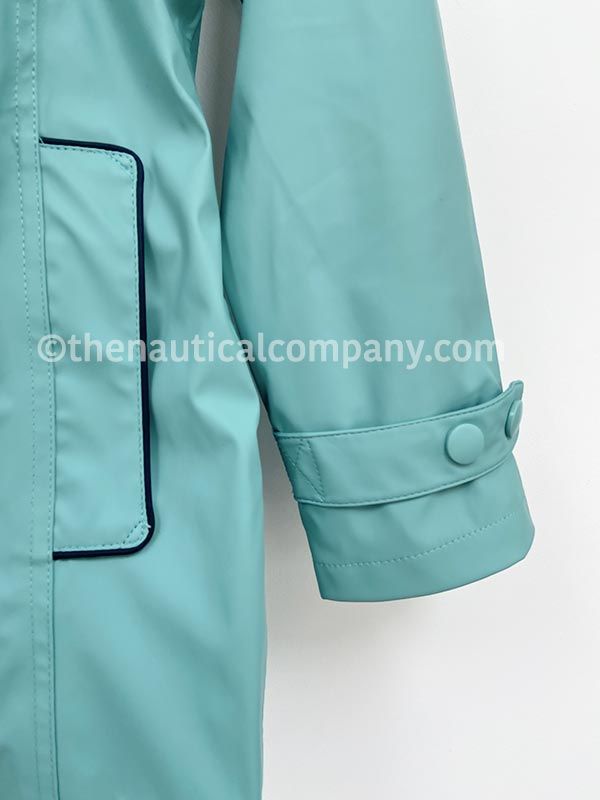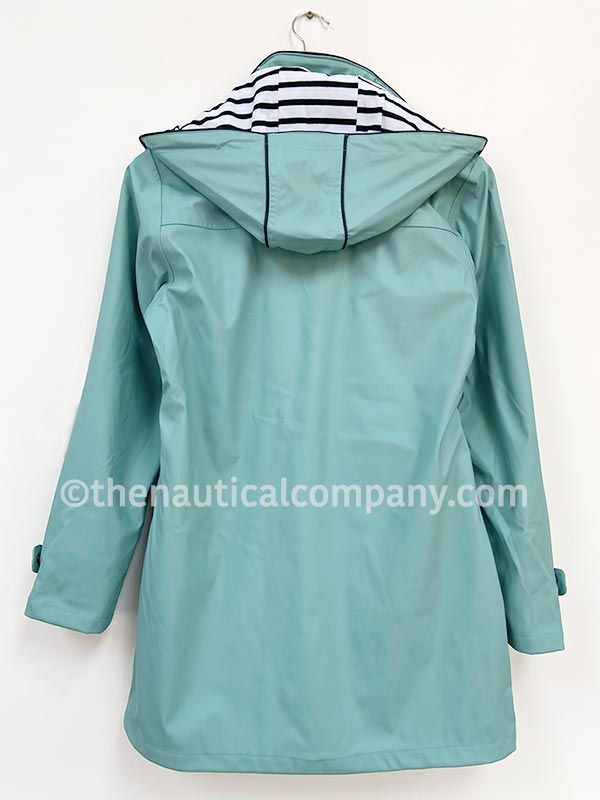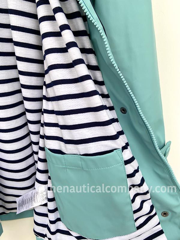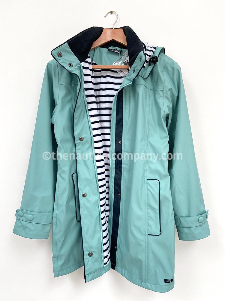 Matt aqua blue/green waterproof jacket with hood for women. This is the newest colour brought out for 2025 for this ever popular transitional Breton style ladies' raincoat parka.
