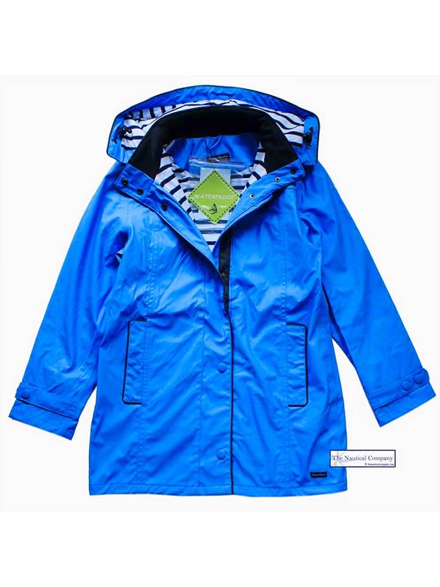 Royal blue waterproof jacket with hood for women. This is one of the two newest colours brought out for 2026 for this ever popular transitional Breton style ladies' raincoat parka. Styled here with our elbow sleeve cobalt blue/white Breton top.