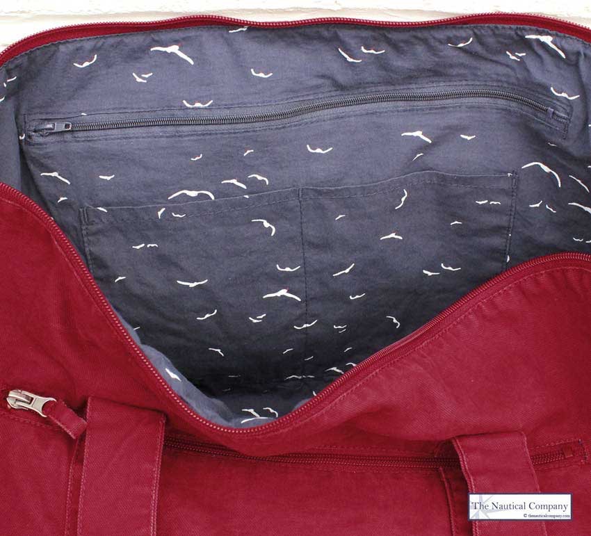 Deep burgundy red wine canvas beach bag with a navy blue base, large size, zipped, long straps, fully lined with a seagull print fabric, including one internal zipped pocket and one large external one too. Well made in quality thick canvas, ideal for holidays, going shopping and sailing trips.