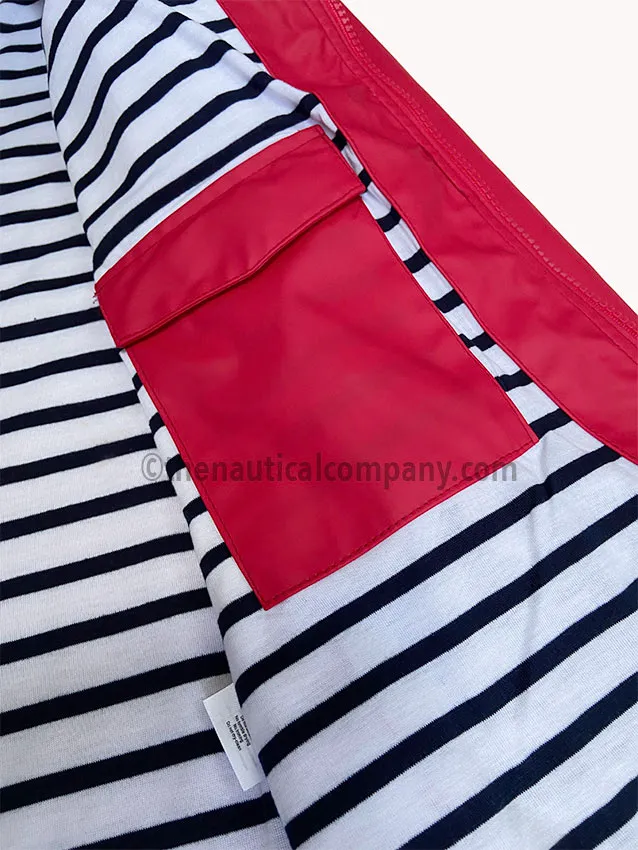 Hooded waterproof jacket for men in plain red. The Roscoff by French label Captain Corsaire, is a classic and easy to wear nautical styled raincoat made of soft PU, fully lined with a polyester white and navy striped fabric.