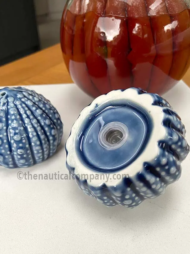 A charming set of sea urchin salt and pepper shakers, beautifully crafted from blue ceramic. The intricate details and easy-to-hold size make them both functional and visually appealing.