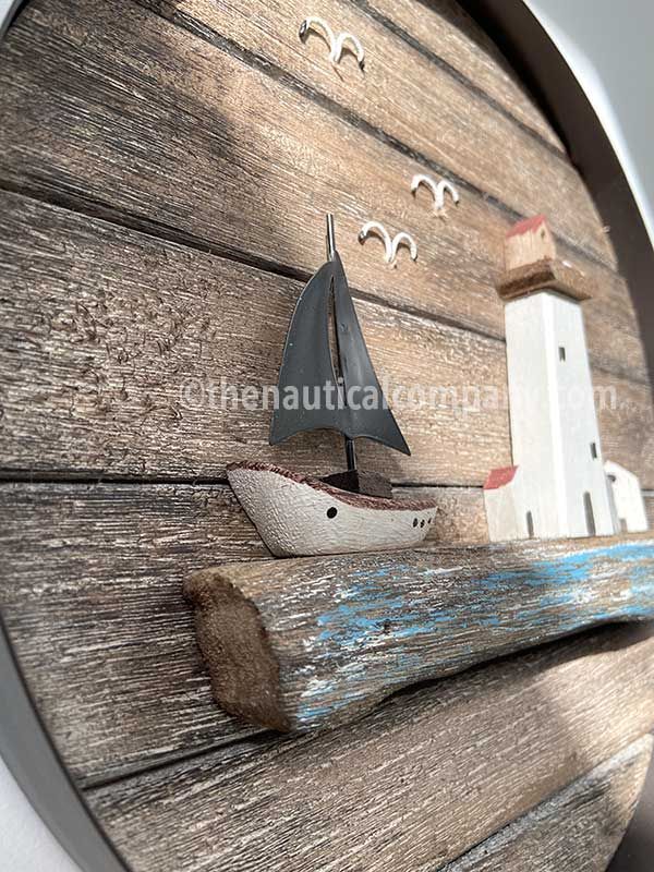 Bring a touch of coastal calm to your home with this beautifully crafted seaside miniature wall hanging. Set within a 30cm (11.8") metal ring, this enchanting piece captures a tranquil scenery featuring a lighthouse, whitewashed cottages, and a graceful sailing boat gliding across the water. Seagulls soar in the background, adding to the peaceful maritime charm. Delicately handcrafted with a mix of materials – the seagulls, boat masts, and sails in metal, with the rest made from wood. This 3D coastal picture offers texture and dimension that bring the scene to life.