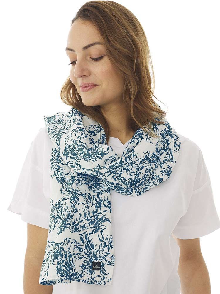 Women's off white linen scarf with a shoal of fish print design in shades of blues from French label, Mousqueton.