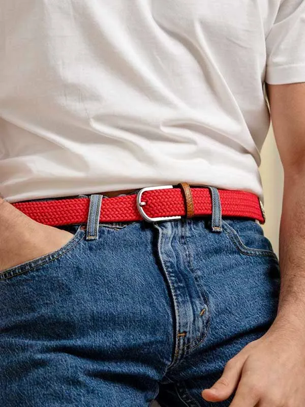 Premium quality woven elastic and leather belt in plain red colour by French label BillyBelt. The elasticated braided design allows a certain amount of stretching to give you a nice comfortable fit. So easy to use, simply put the prong through the belt, no more holes !
