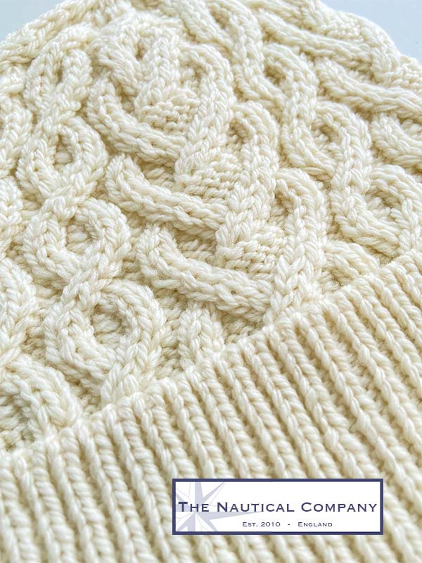 Superb quality Aran beanie hat knitted in cream 100% pure super soft merino wool. Designed with the classic chunky cable & heart knit pattern. Very warm for our cold winters.