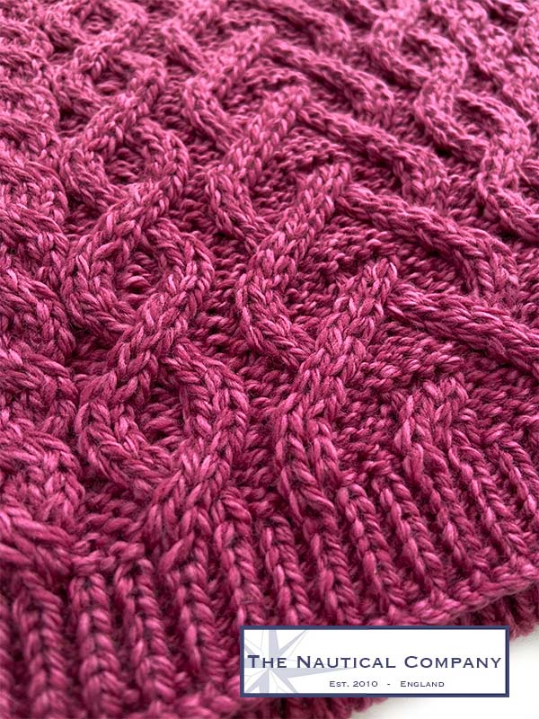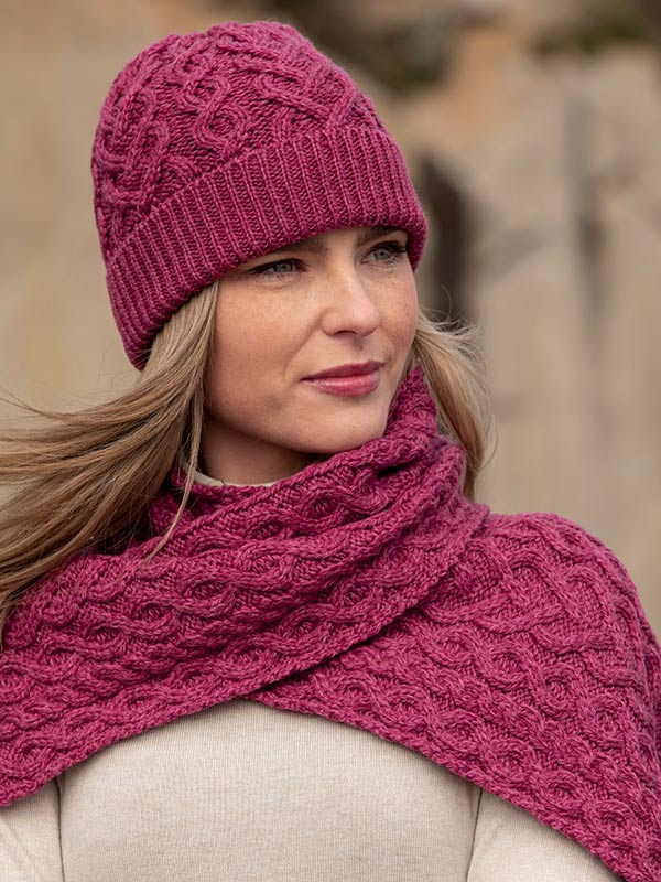 Beautiful Aran scarf knitted in raspberry pink 100% pure super soft merino wool, designed with the classic chunky cable & heart knit pattern. Guaranteed to keep your neck nice and warm.