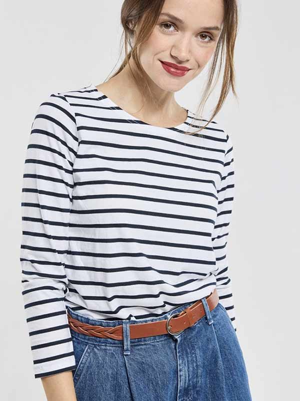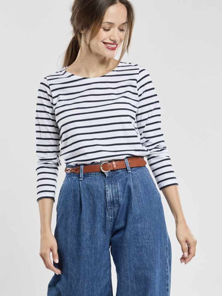 A classic light jersey cotton striped tee shirt for women by French label Armor Lux. Long sleeved round neck shirt in mainly white with dark navy stripes.