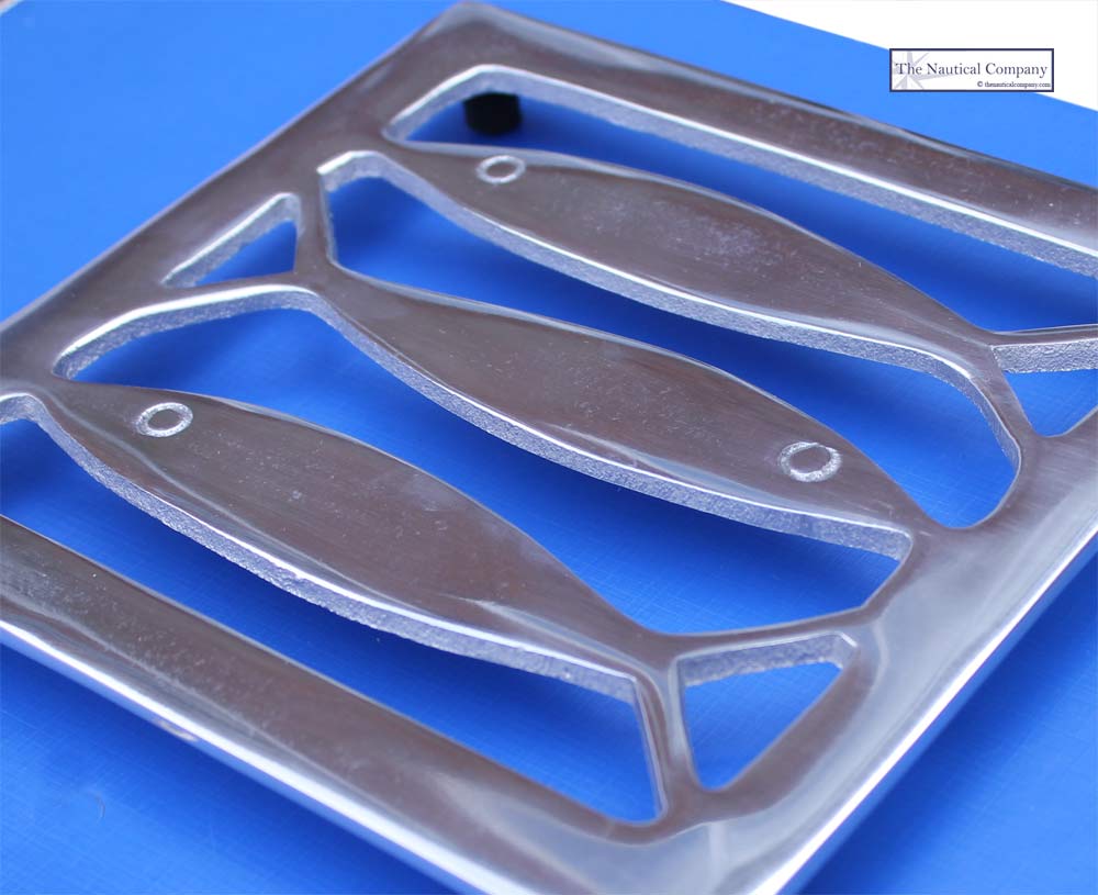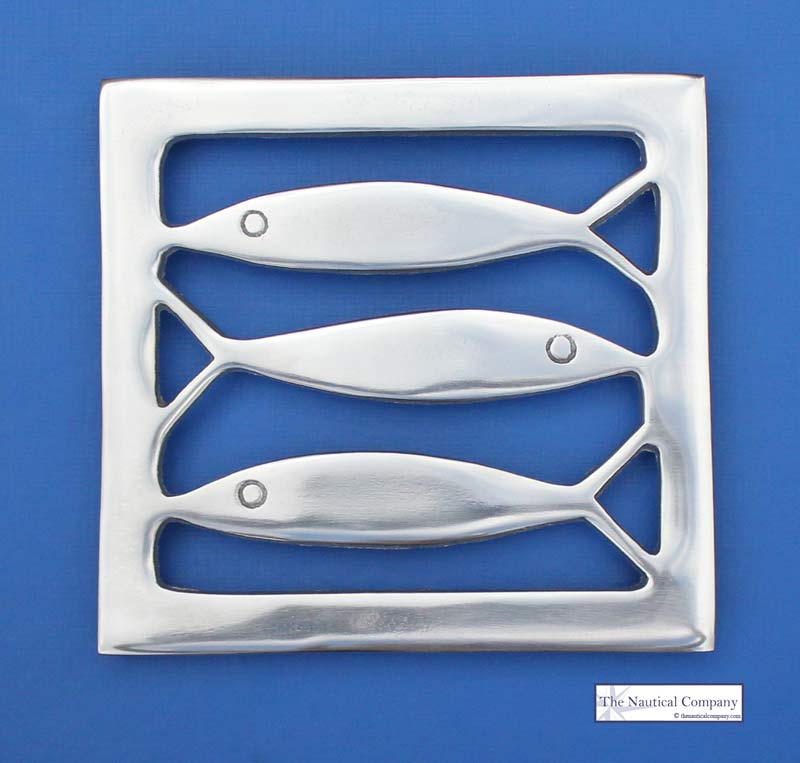 Contemporary coastal trivet in stainless steel metal featuring a design of three fishes. Ideal to fit in any seaside kitchen.