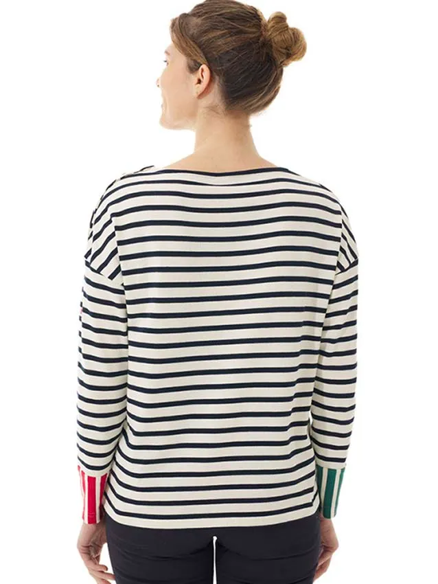 Nautical take on the classic ecru and navy Breton top brought by French label Mousqueton, perfect for sailing enthusiasts. Just in case one may forget its port and starboard sides, this ladies' striped top will always be there as a referential. Made in cream medium weight cotton with navy blue stripes, we like the classic shoulder opening with its red anchor buttons, his long cuffs in nautical colours: in green with the right sleeve to define Starboard embroidered in French as "à tribord" and red with the left sleeve to define Port embroidered in French as "à bâbord".
