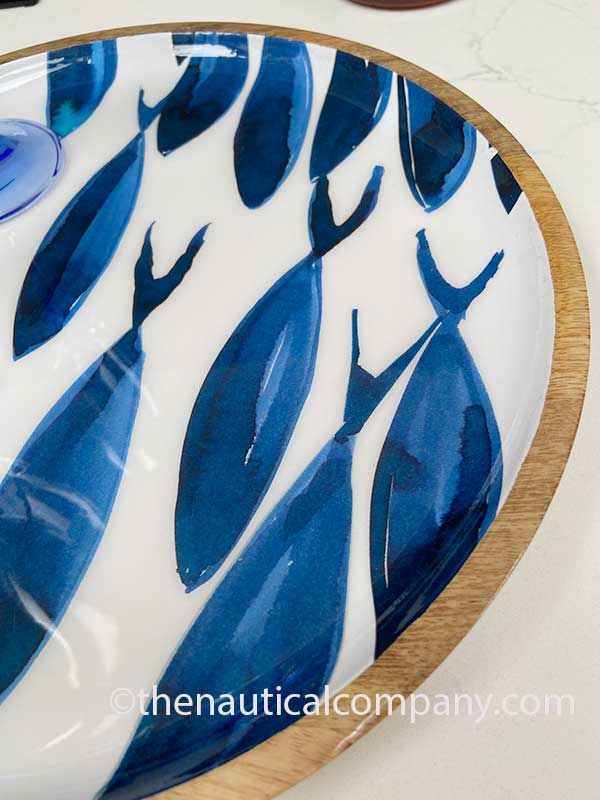 Beautiful sea life theme round platter handcrafted in mango wood and decorated with an enamel design of large blue fishes over a white background.