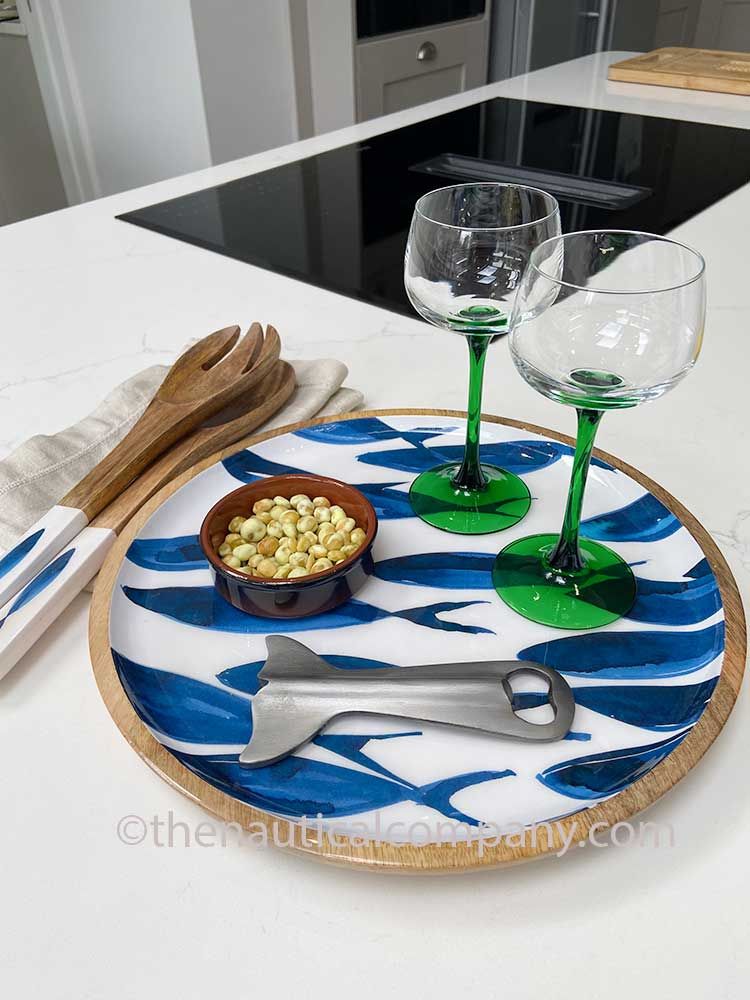 These trays are ideal for food serving and will fit perfectly in a seaside kitchen. Style here with the matching mango wooden blue fish salad serving spoons and our whale tail bottle opener.