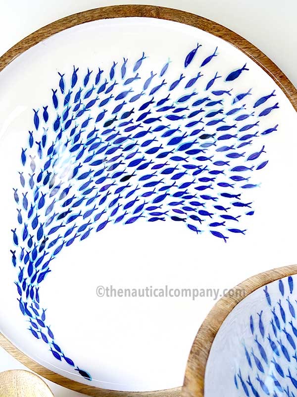 We love those platters made of mango wood that we stock in different enamel designs. This one is the blue fish school over a white background. This medium round tray is ideal for food sharing and will fit perfectly in a seaside kitchen.
