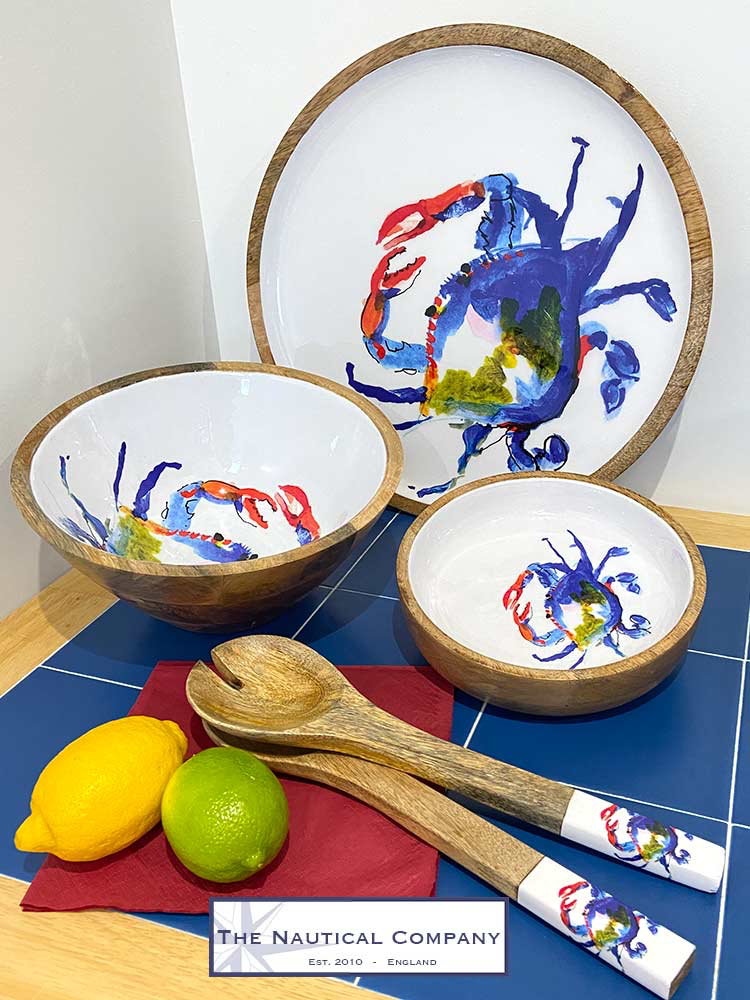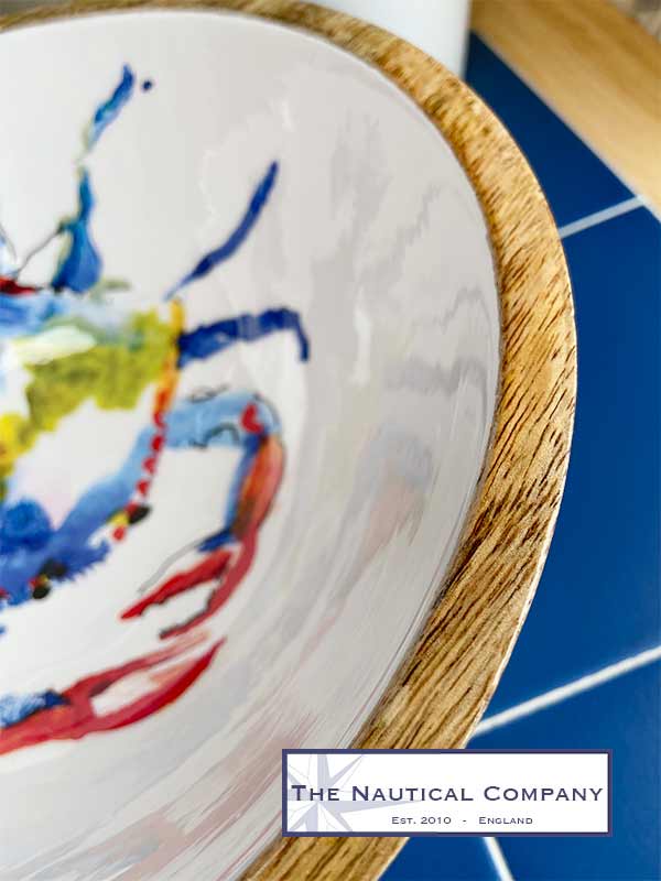 Striking colourful crab designed mango wood salad bowl. Great addition to a coastal kitchen. Suitable for cold food type only.
