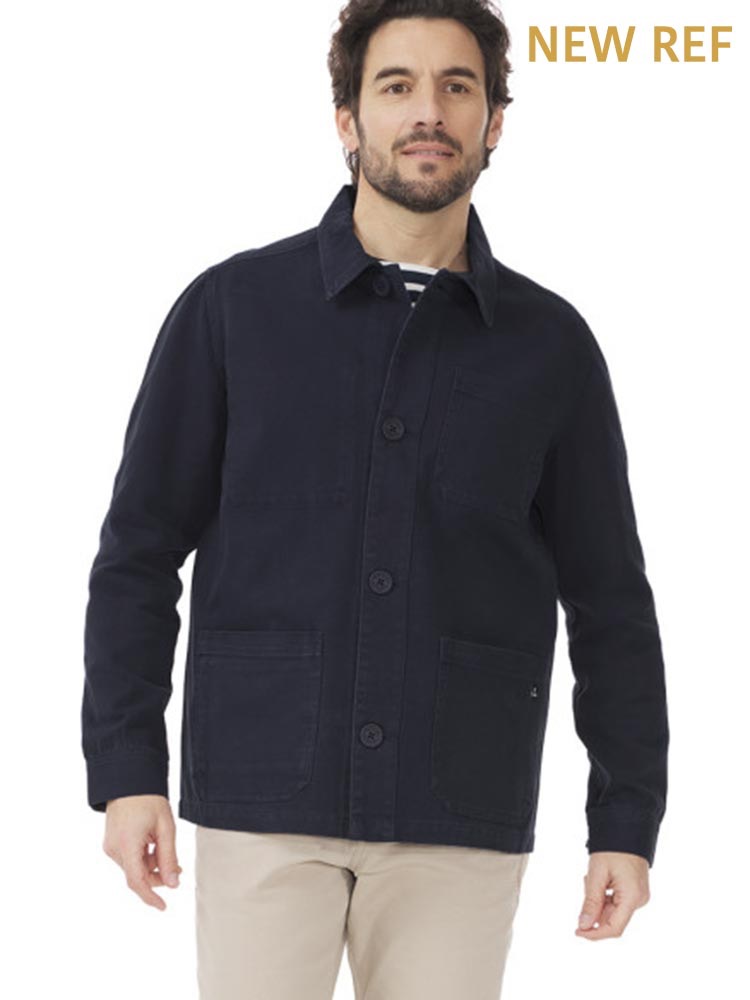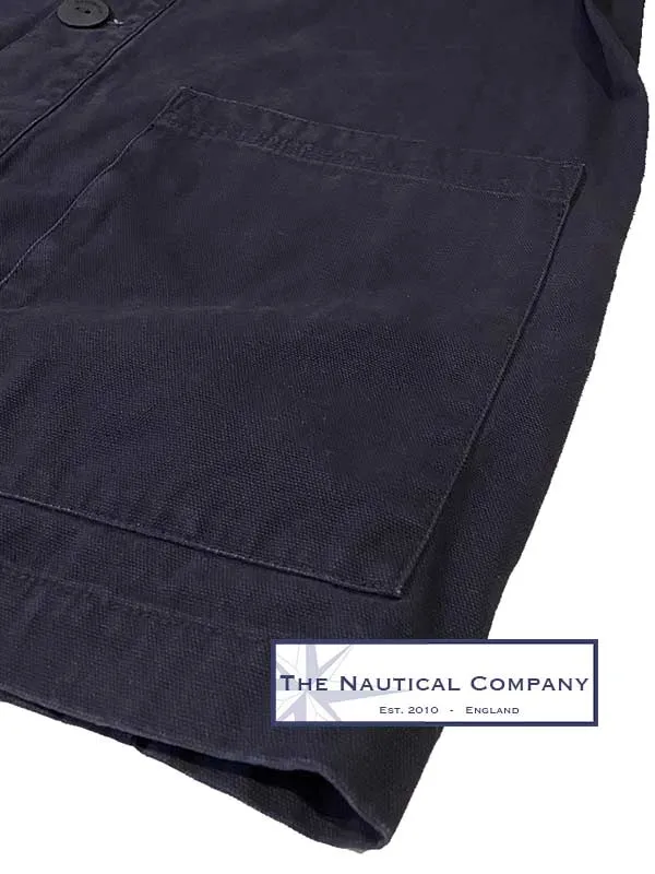 This is Mousqueton's French work jacket for men, the Hiliz & Hizilig, in navy blue. Made in quality heavy cotton canvas, unlined single breasted with flat buttons, a flat collar, two large front pockets, one small front chest one and two internal pockets, one with a zip to keep your small belongings safe.