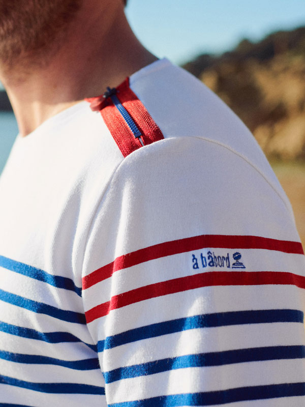 Traditional long sleeved Breton shirt for men with a fun twist by French label Mousqueton, perfect for sailing enthusiasts. Just in case one may forget its port and starboard sides, this striped top will always be there as a referential. Made in white medium weight cotton with navy blue stripes from chest down, we like the red and blue shoulder zip opening with its two red stripes on the right sleeve to define Port embroidered in French as "à bâbord" and two green stripes on the left sleeve for starboard embroidered in French as "à tribord". Side slits and fabric label tag on front bottom hem.
