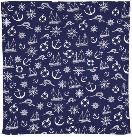 Classic square navy blue bandana scarf with printed nautical motifs. To use around the neck or head.
