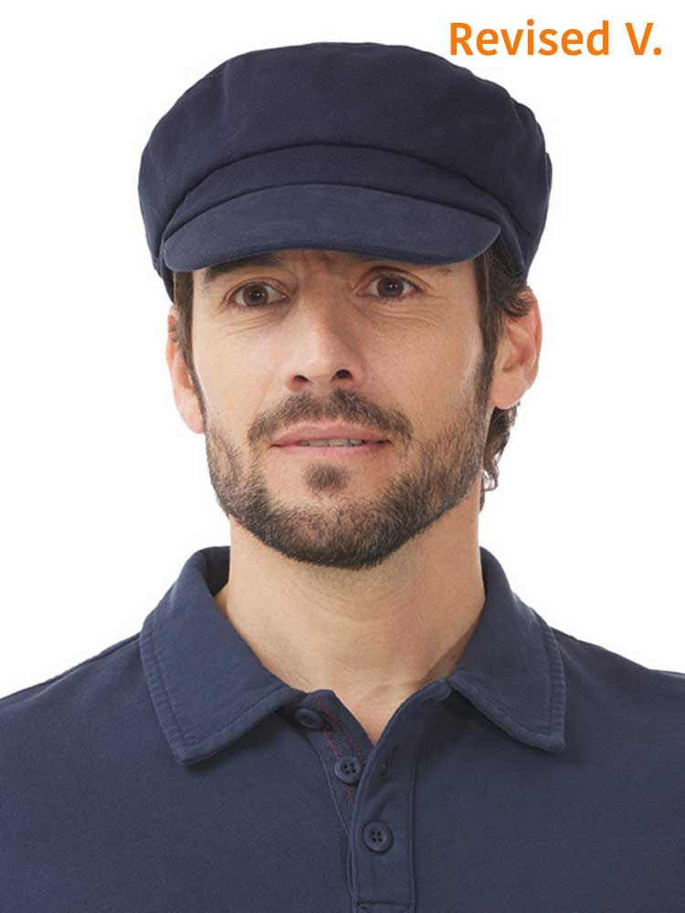 Our 1st image of the young man with the navy cap wearing a striped top is featuring the old original version with the flexible brim. It has been replaced by the solid brim modelled with our 5th image