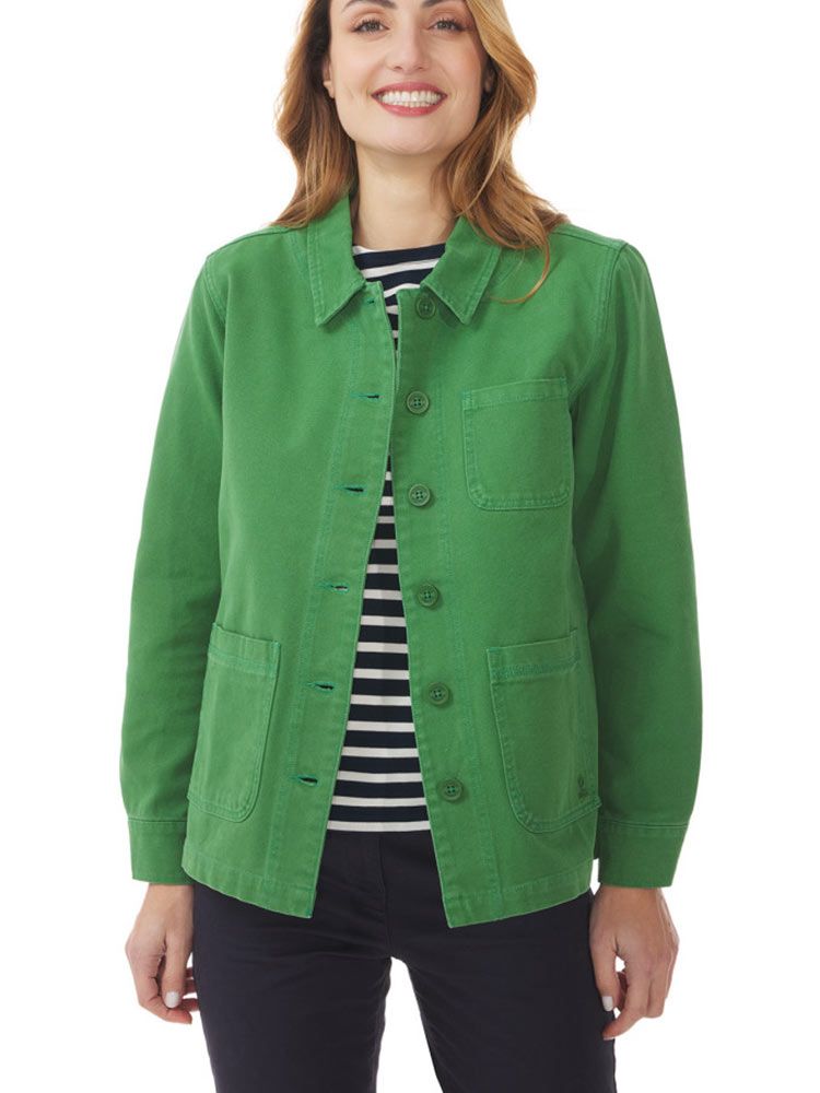 Classic French work jacket for ladies in green designed by French label Mousqueton called Bigili. A beautifully crafted high quality cotton jacket, single breasted with flat buttons, a flat collar, two large front pockets, one small front chest one and one small internal one with zip to keep your small belongings safe.