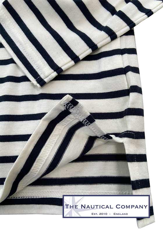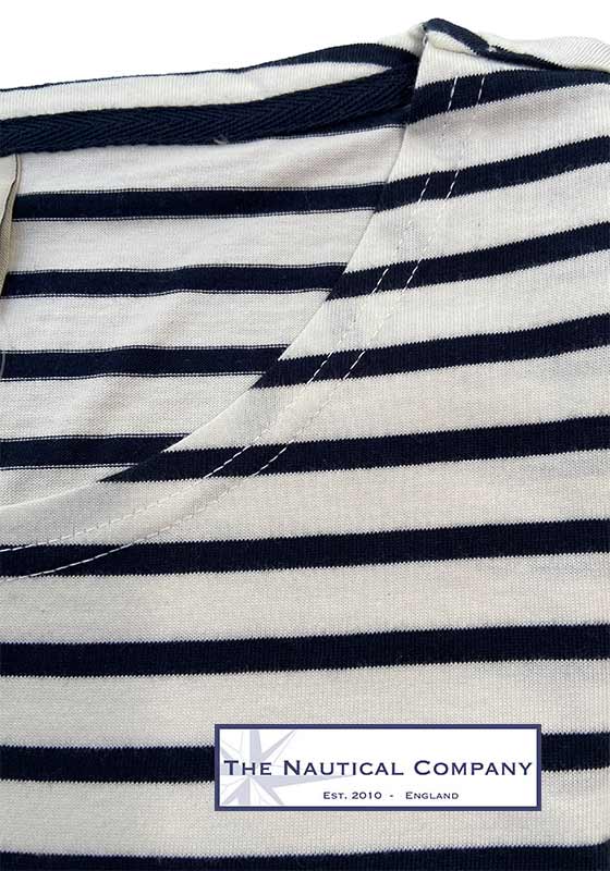 Summer long sleeved cream (ecru) tee shirt with navy blue stripes, for ladies from French label Mousqueton. Made in 100% lightweight organic jersey cotton, brand logo on one sleeve, side slits. Generous in length, semi-fitted, round neckline and easy to wear under one of our dungarees or team with a pair of bermuda shorts.