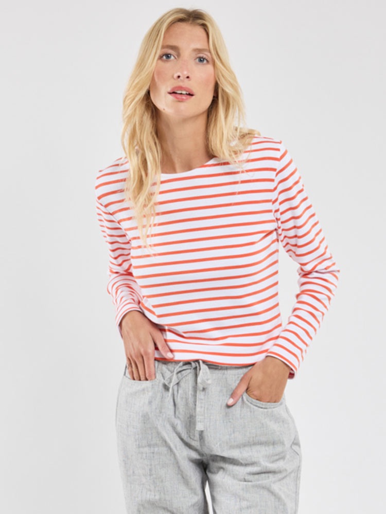 Women's Breton striped top made in soft thick cotton by French label Armor Lux. This is a long sleeved round neck shirt in mainly white with coral stripes. Small fabric label on sleeve.