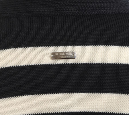 Made in France stunning long striped cardigan from French nautical designer label, Royal Mer Bretagne. V neck with dark navy blue and cream striped front pockets and body, plain 3/4 sleeves with narrow rib knits, fastened with a belt and press studs. Label branding on small metal plate on upper middle back.
